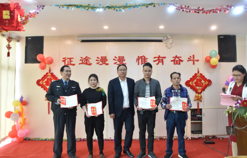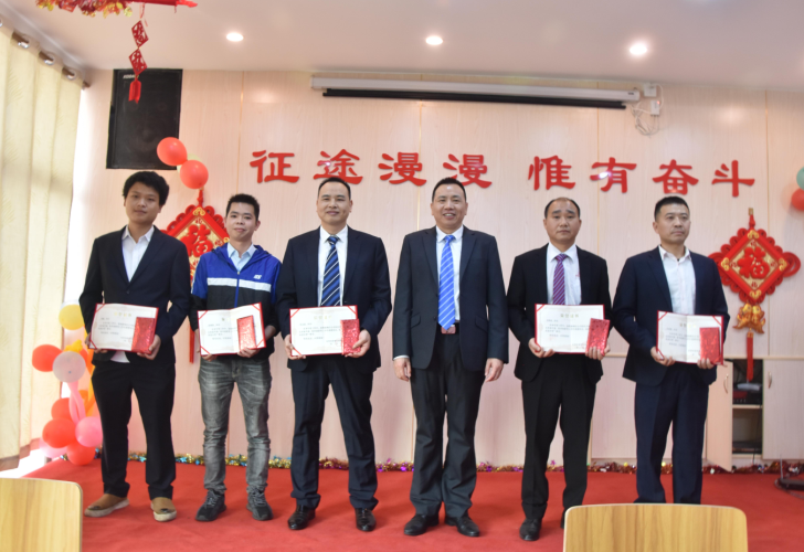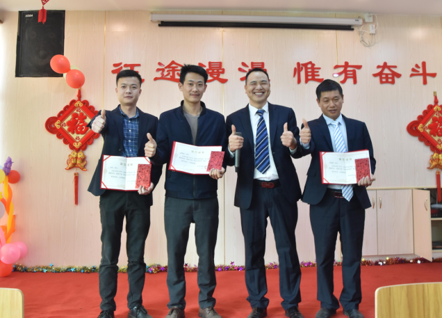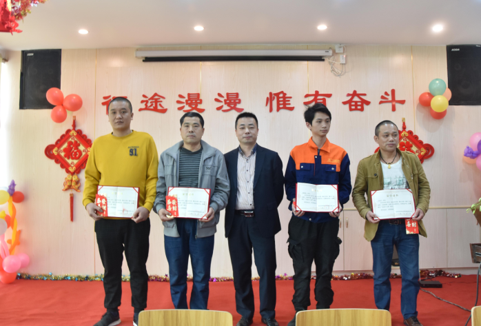 營銷部經(jīng)理伍綱強為邱高明、周美芳、黃榮先、龔超頒發(fā)先進個人獎