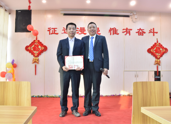 市場營銷部經(jīng)理羅曉明為付新民、黃文頒發(fā)優(yōu)秀管理獎